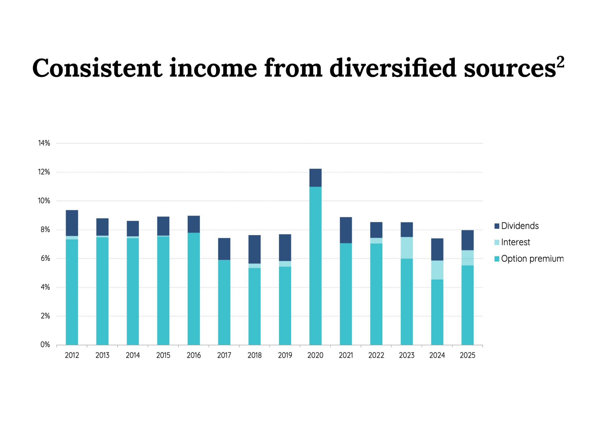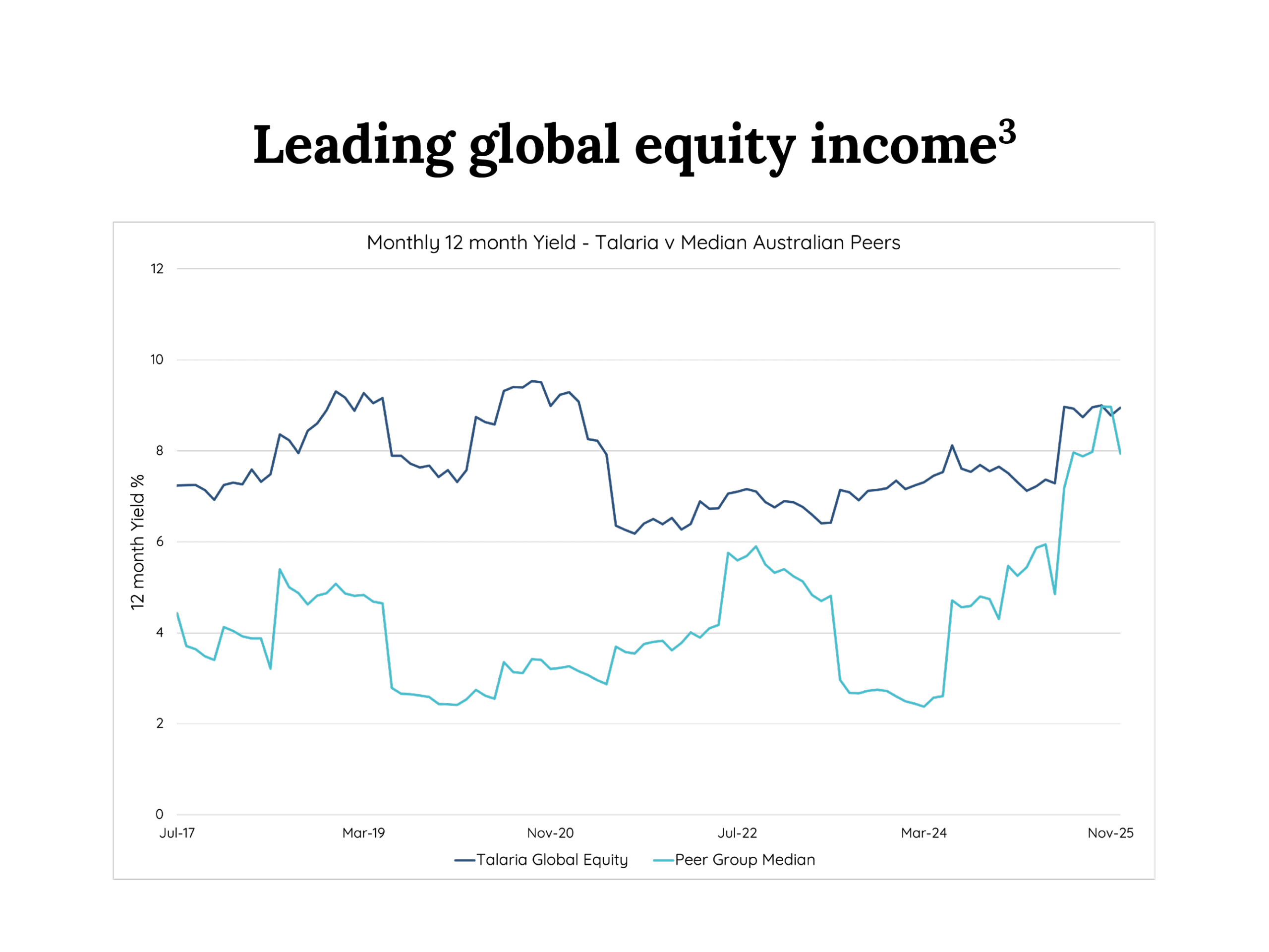 3 Source: Morningstar, July 2017-December 2025. Peer group is Australian based active global equity funds, 12 month yield.