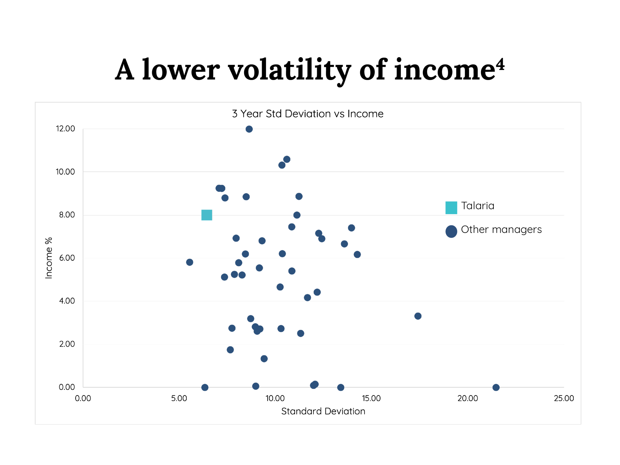 We recognise the journey is as important as the destination, so less volatility is always better. Talaria’s unique and alternative investment process has resulted in the strategy delivering significantly less volatility than the market.