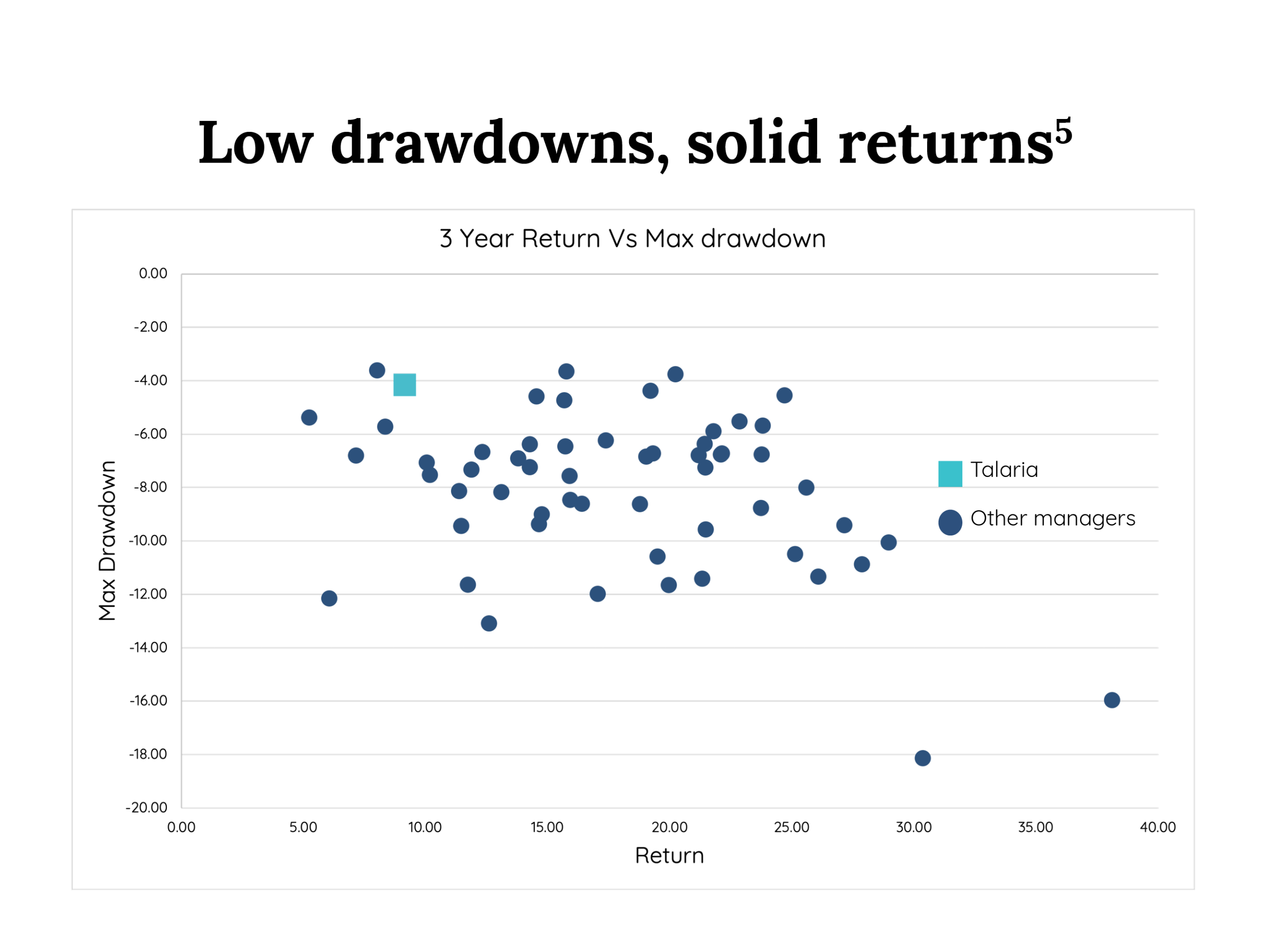 Talaria’s unique investment process means it has significantly less drawdowns than the market since inception, meaning investors have more money working for them in the upturn, leading to more consistent and sustainable investment returns over time.